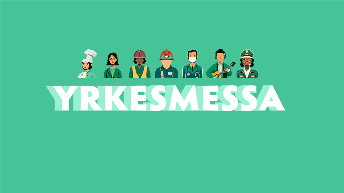 Illustrasjon hvor det står Yrkesmessa. Grønn bakgrunn og grafiske ikoner av mennesker som illustrerer forskjellige yrker. - Klikk for stort bilde